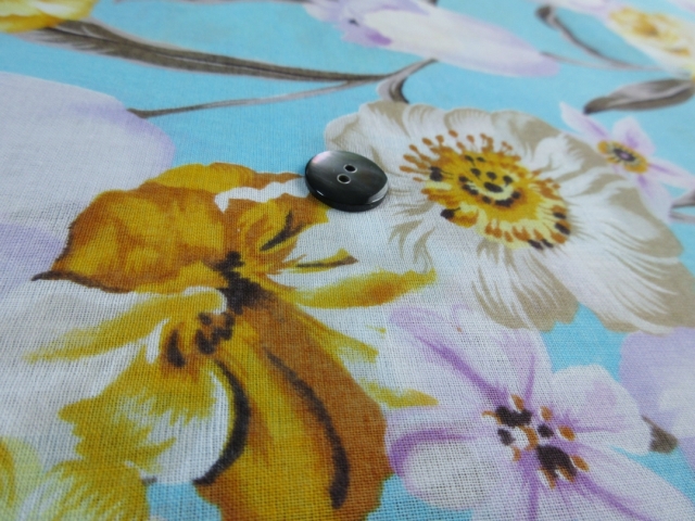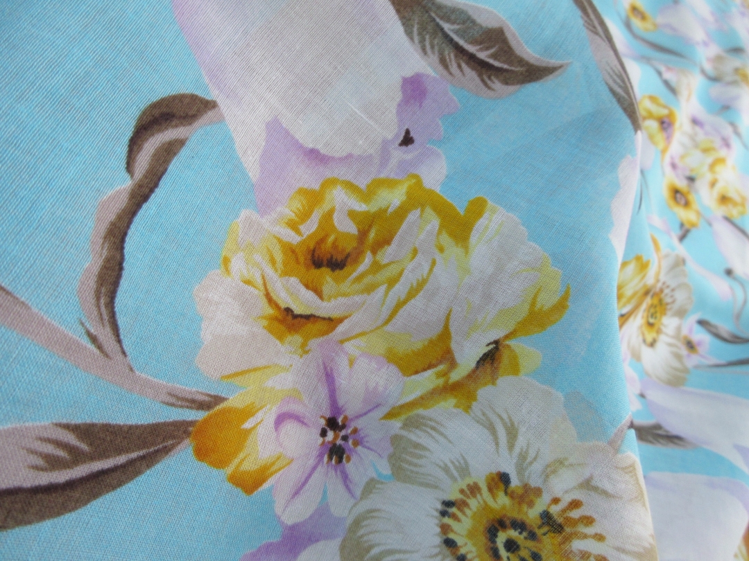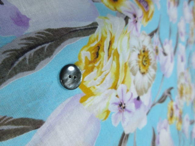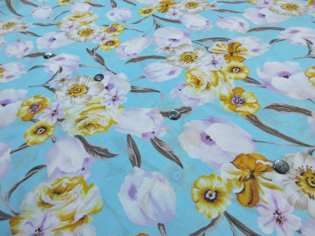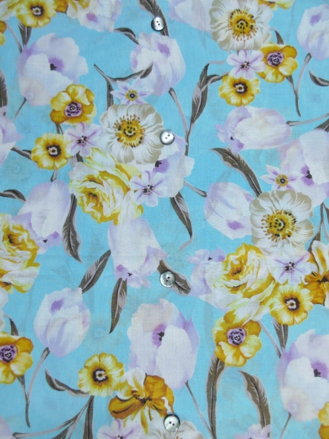 爽やかなブルーに華やかな洋風の花がデザインされた夏にぴったりの柄です。 生地は綿100%で織り方はローン織りとなります。 ローン生地は細い糸を使った平織りの布地で、薄手で軽く、さらっとした肌触りが特徴です。 光にかざすとやや透ける程度の透け感がありますので、Tシャツやタンクトップの上に重ね着をして着るのがおすすめです。 通気性がいい綿で、なおかつ熱がこもりにくいローン生地ですので、蒸し暑い日本の気候にぴったりな素材です。