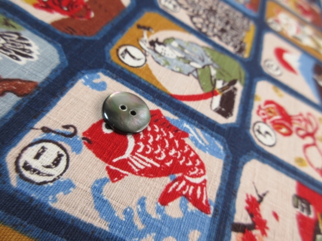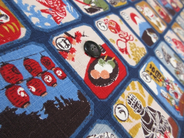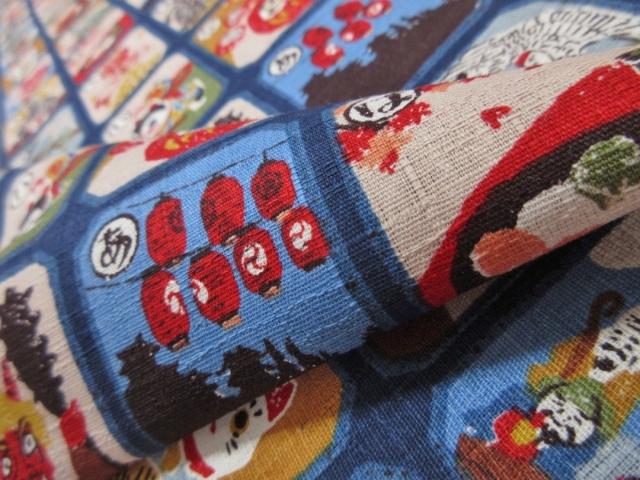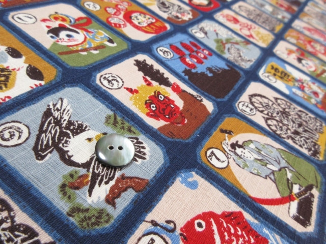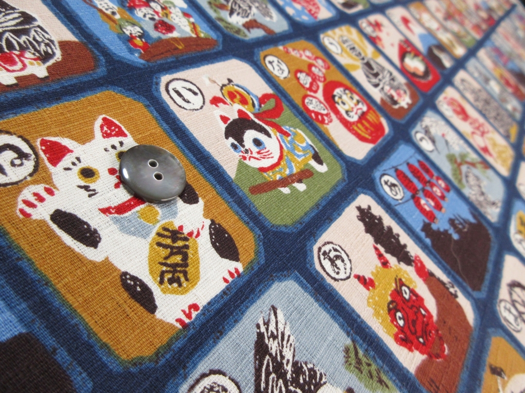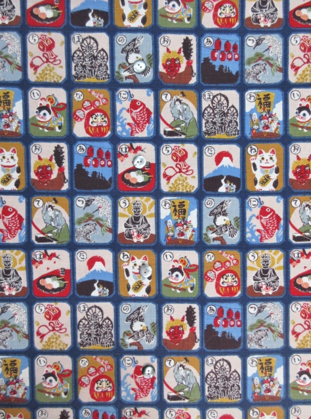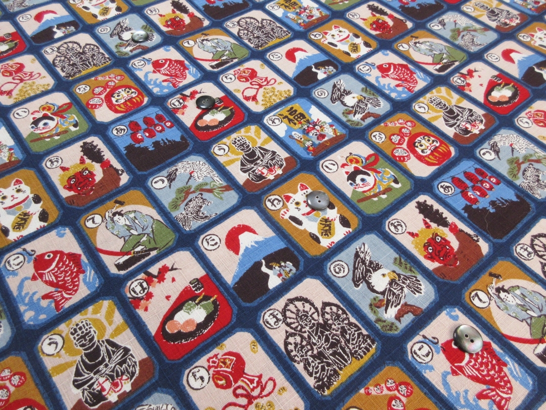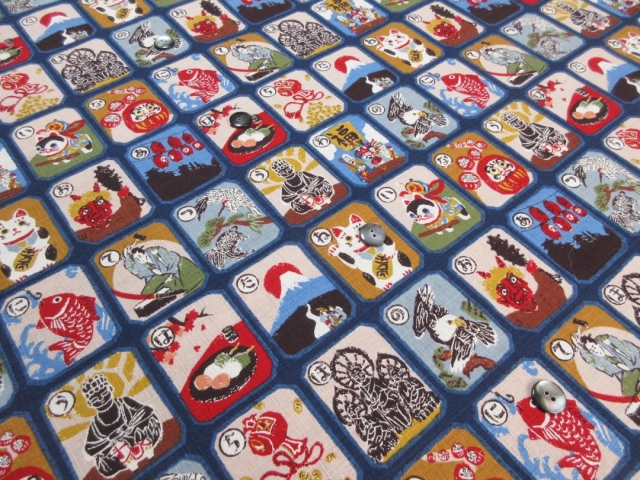 招き猫や七福神などの縁起のいい柄や、鬼や鷹やお祭りなどバラエティー豊かな日本の伝統が凝縮した楽しい柄です。 それらがかるたのデザインとなっていますのでさらに遊び心があります。 細やかなデザインは見ているだけで楽しい気持ちになります。 規則正しい柄はモダンでお洒落な雰囲気がありますね。 生地はしっかりした風合いのドビー綿で高級感も抜群です。