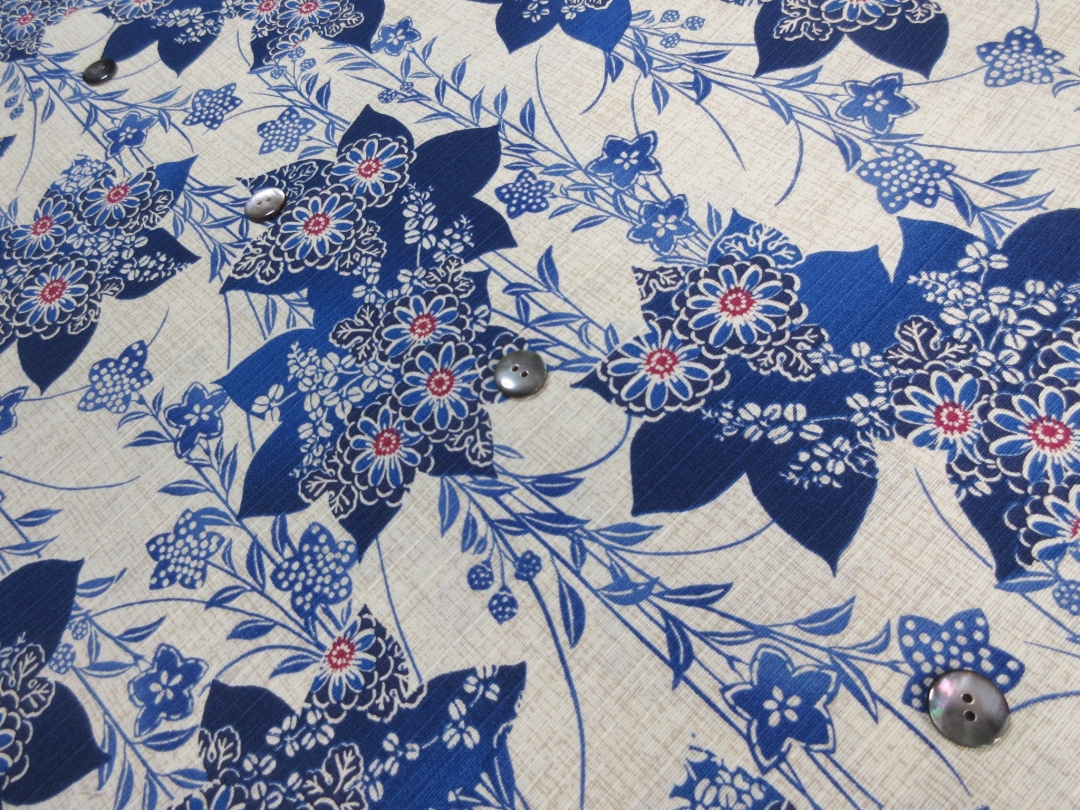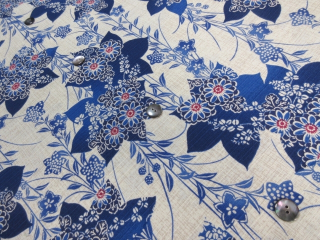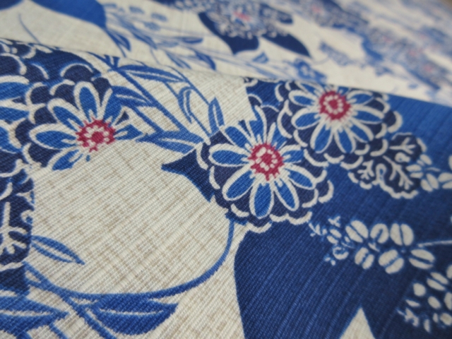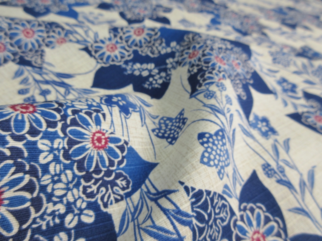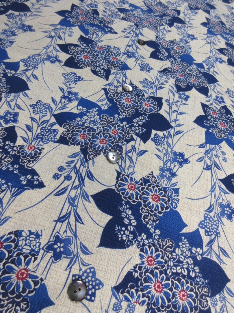 涼し気なスラブ織りの綿が使用されています。 糸のムラがそのまま生地の表面の節として現れるため、平織りの生地より表情が豊かに見えます。 ナチュラルな風合いが特徴で、着心地も素晴らしい綿となります。 この素材はベージュとブルーが特徴で大変涼しげな配色となっています。 柄は桔梗をメインとしたものとなります。 この素材は生地幅の関係から半袖のみのオーダーとさせて頂きます。