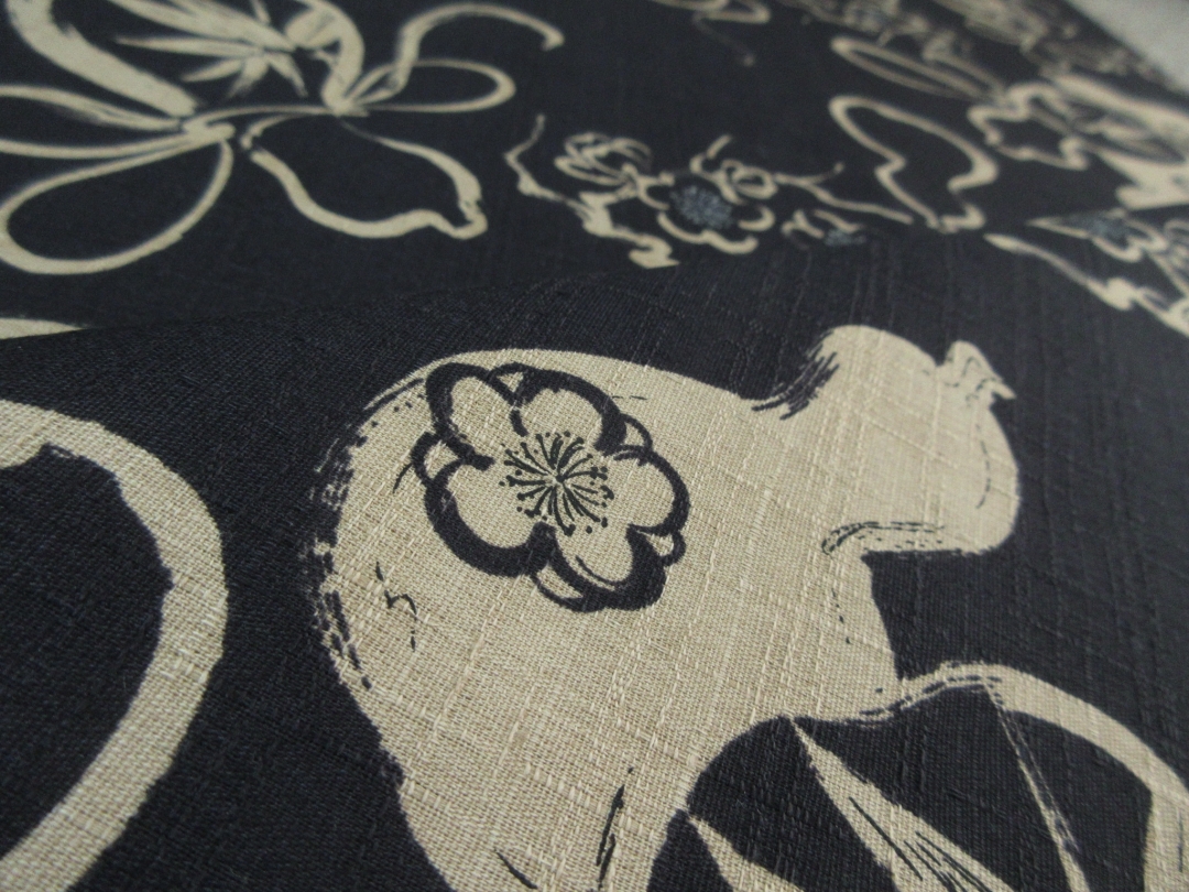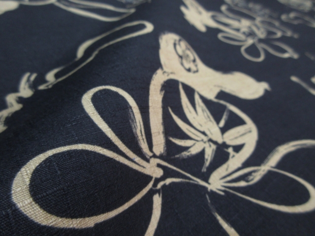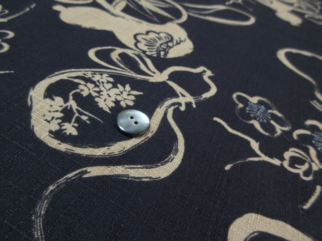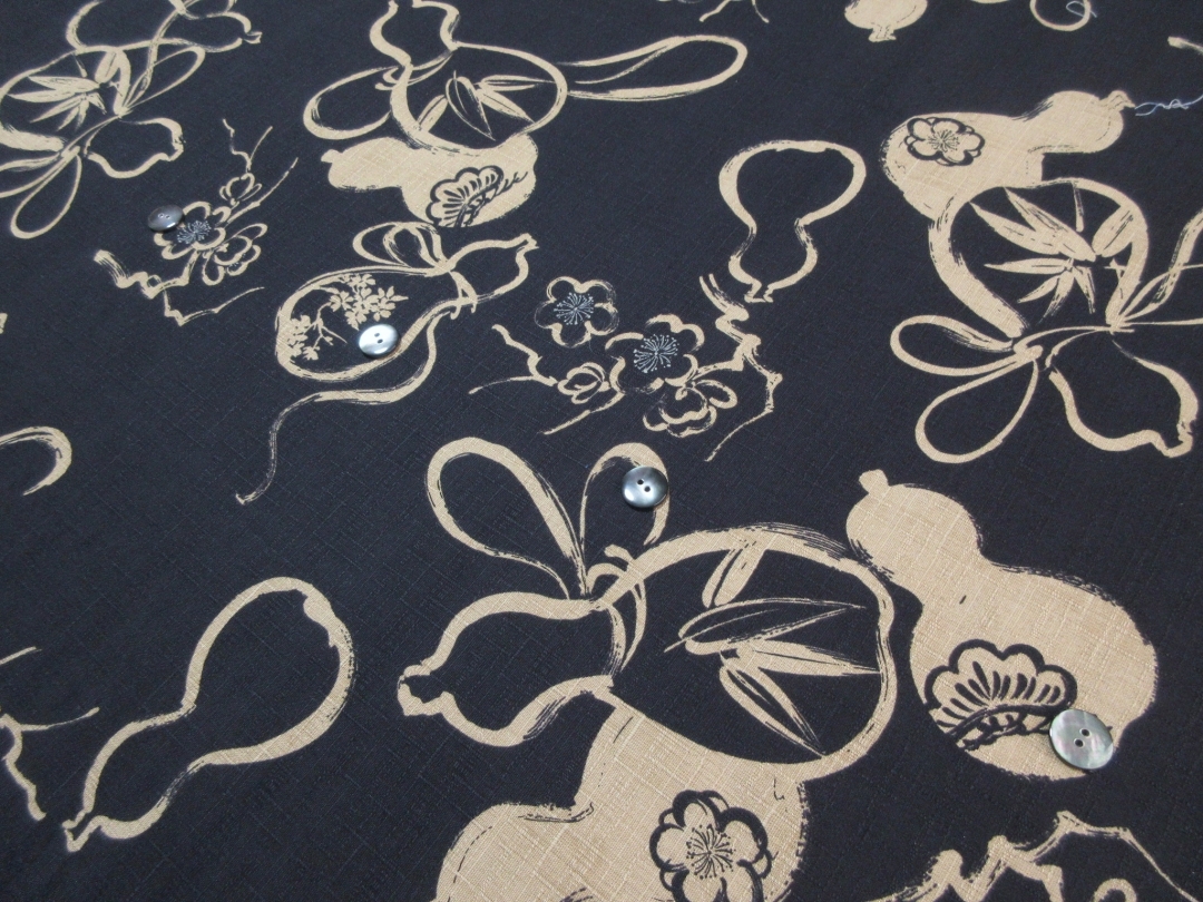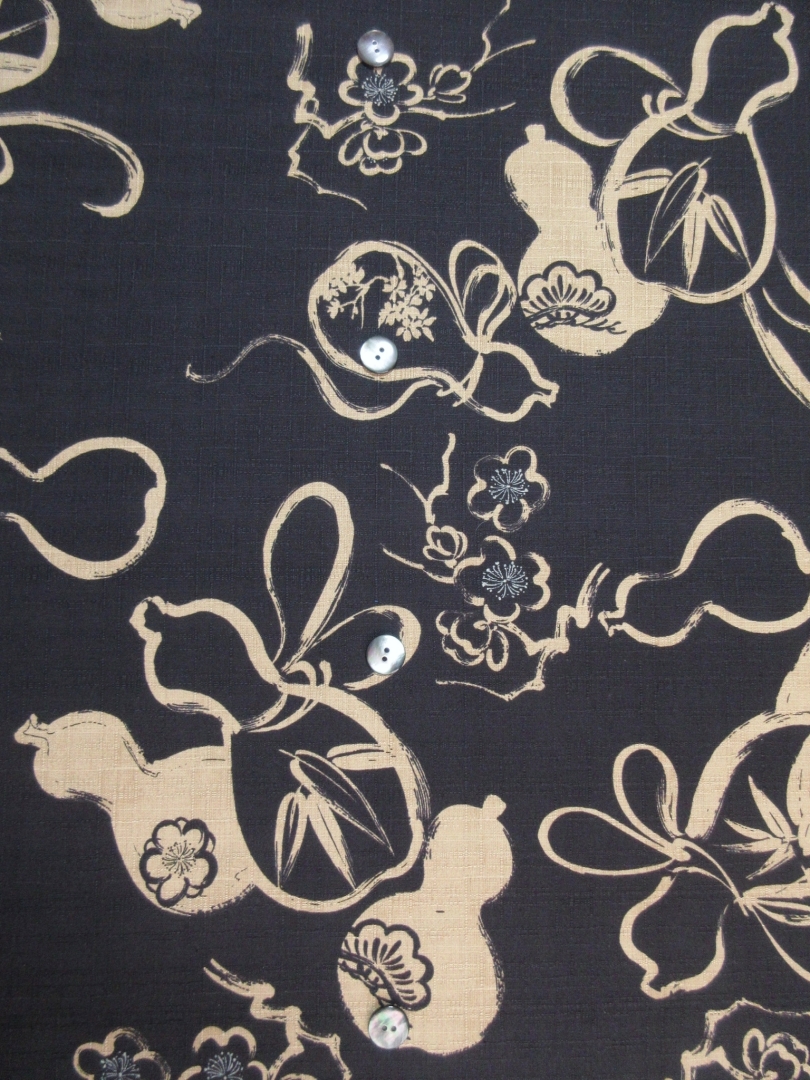 縁起物「瓢箪」が粋にデザインされた和布からアロハシャツをお誂えさせて頂きます。 瓢箪は皆様ご存じの通り、くびれた独特の形から邪気を封じ込める柄として「無病息災」を表す柄として使われます。 またふくらみが下に向かうほど大きくなる形から「末広がり」としても人気がございます。 そんな縁起物の瓢箪をシンプルに模様化した和布がこちらでございます。 合わせてデザインされいるのは梅、松、笹となり、こちらも松笹梅としておめでたい柄となっていますね。 生地はドビー綿と呼ばれるしっかりした風合いの素材で特徴としては生地の表面に見られる織り柄がございます。 微かな織り柄は生地の表情を豊かにしてくれています。 平織では得られない高級感のあるかっちりとした形のアロハシャツへと仕上がります。 こちらは黒地となります。