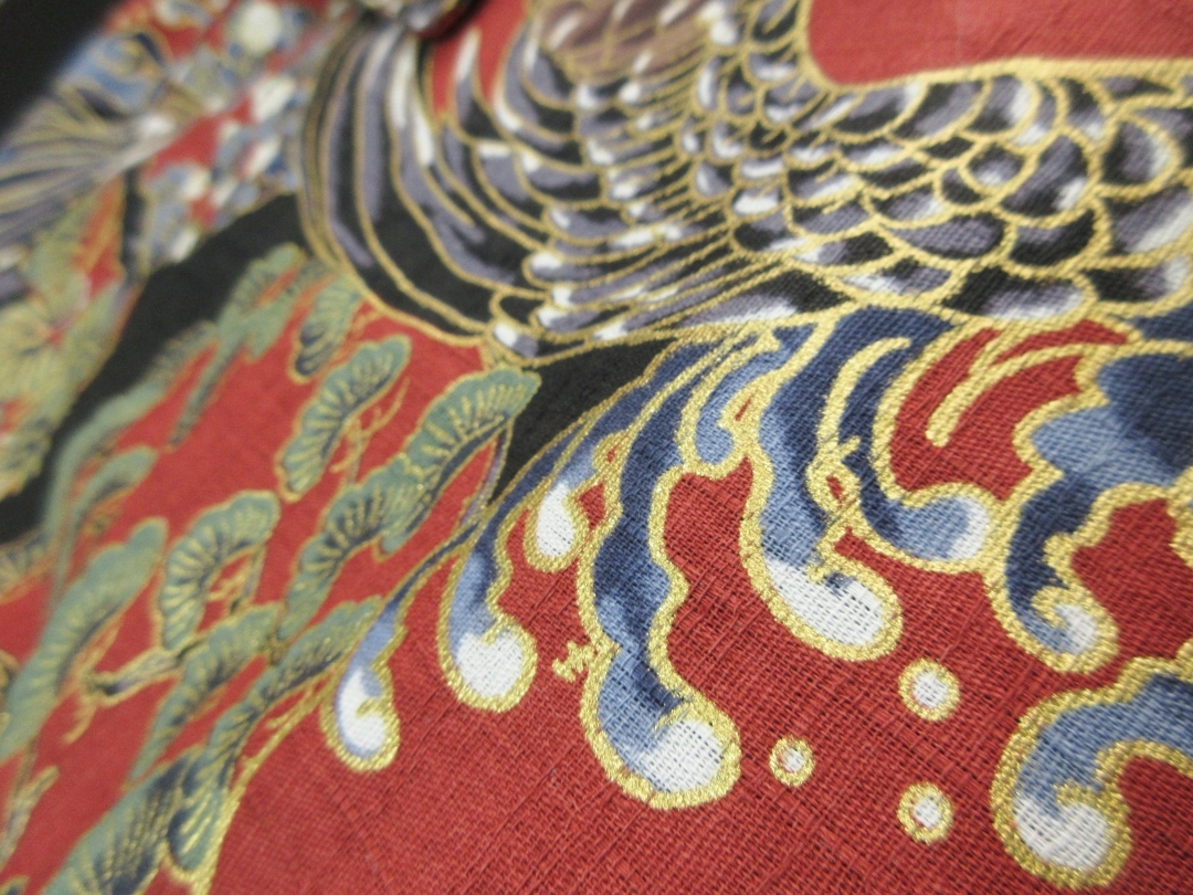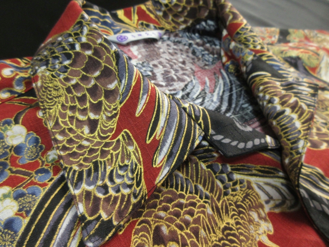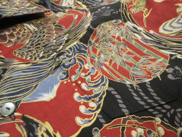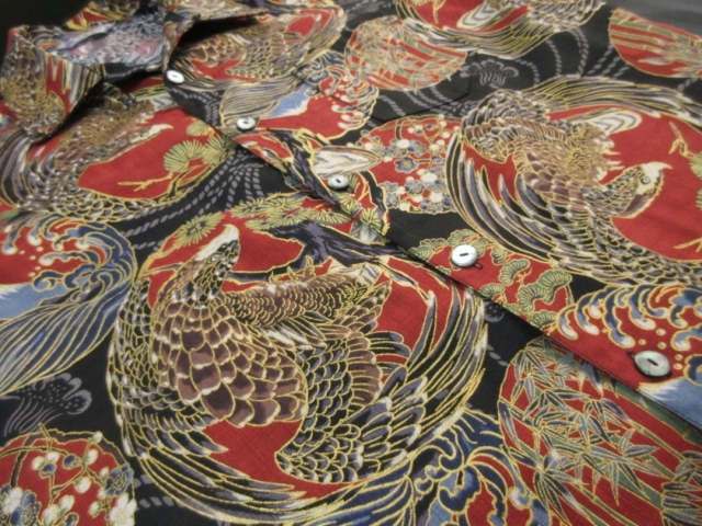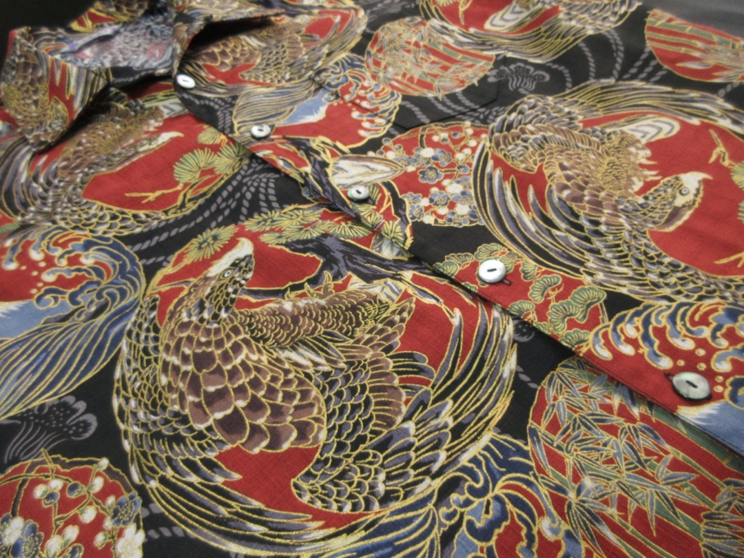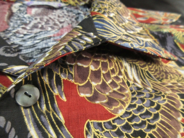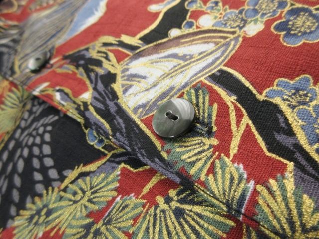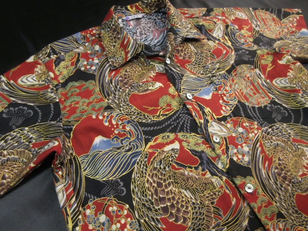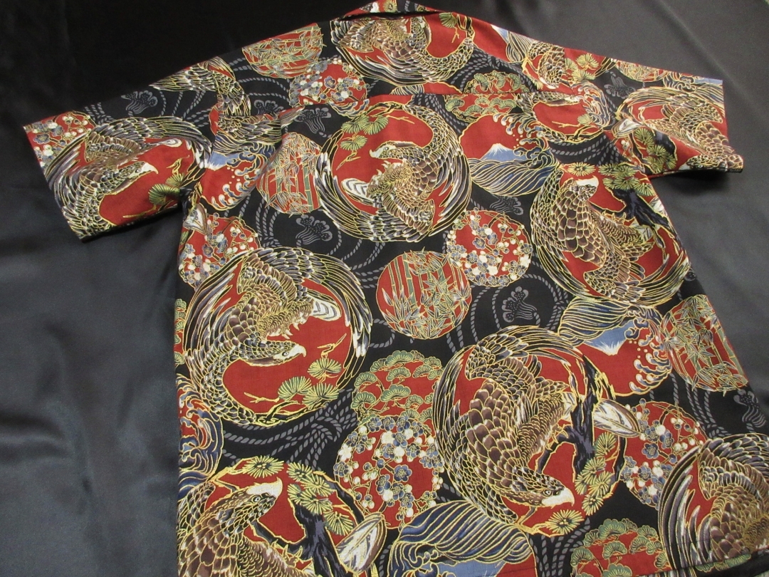 迫力ある鷹柄を丸い紋に見立ててデザインしたアロハシャツとなります。 生地は不規則な節が入った高級ドビー織り綿が使用されています。 柔らかで程よい厚みのある生地でしっかりした形のアロハシャツです。 鷹の柄は千里眼になぞられて「先を見通す力」があるとされ、運や幸せを掴んで離さないという意味があります。 そんな縁起のいい柄である鷹に加えて、富士や松の柄もデザインされており、まさしく縁起物に溢れたおめでたい柄と言えます。 金彩加工が施された立体感のある柄、緻密なデザインのアロハシャツをお楽しみ下さい。 この商品は1点もので、現品のLサイズ、半袖、黒蝶貝ボタンとなります。