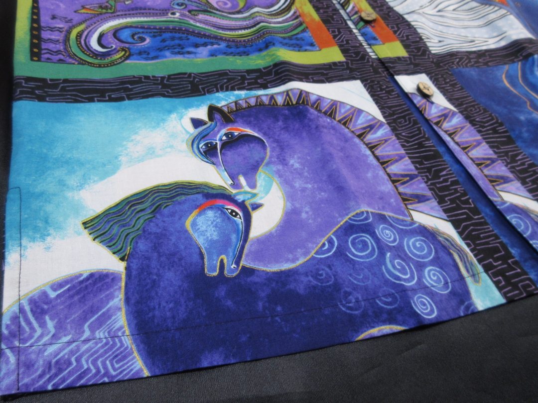 前後とも大きな格子の中に独特のタッチで馬がデザインされた幻想的で不思議な世界を持つアロハシャツです。